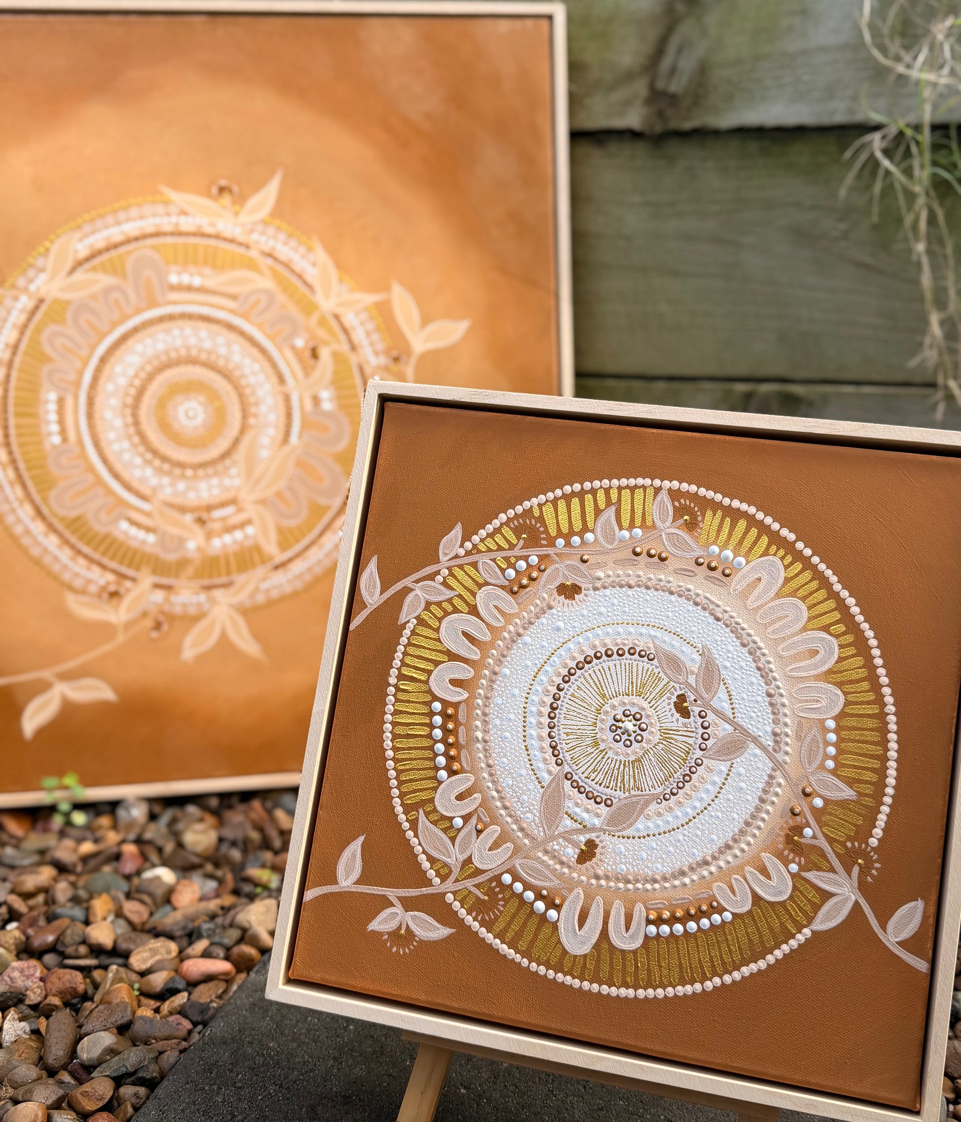 Inspired by the natural colours of the land, warm earthy tones with a meeting circle at the heart of this painting. Flowing plants signifying growth, renewal and connection between land and nature.